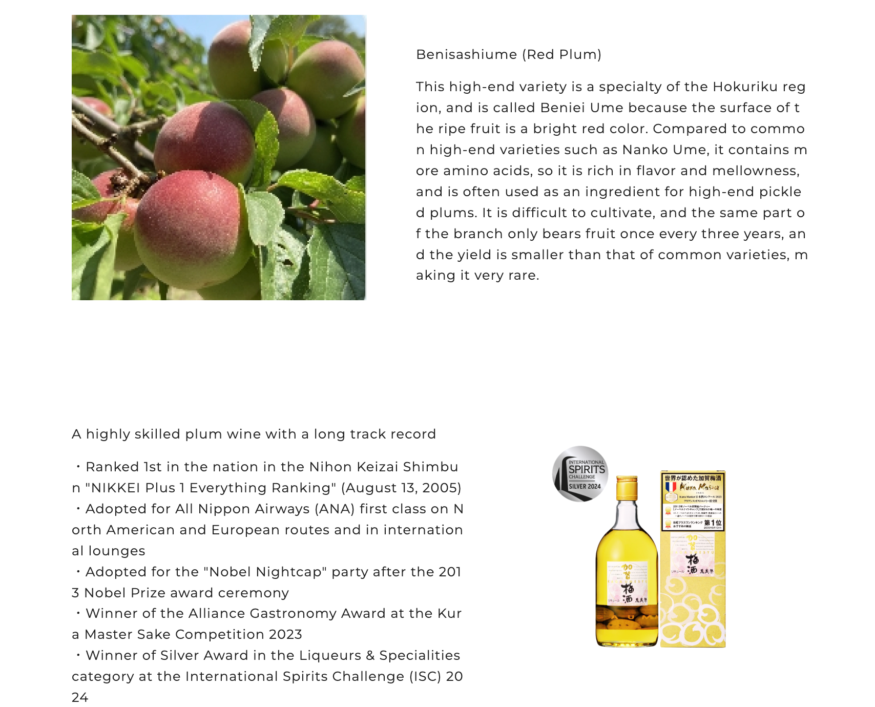 Award recognition: Having won first place in the Nikkei Plum Wine Awards, and having been the special wine for the 2013 Nobel Prize Dinner, these accolades are all proof of the high quality and recognition of this plum wine.Home-grown base sake: The base sake is Banzaira's home-grown sake. The brewery has a wealth of experience and expertise in the sake brewing process, and the high-quality sake base provides a solid foundation for the quality of the plum wine.